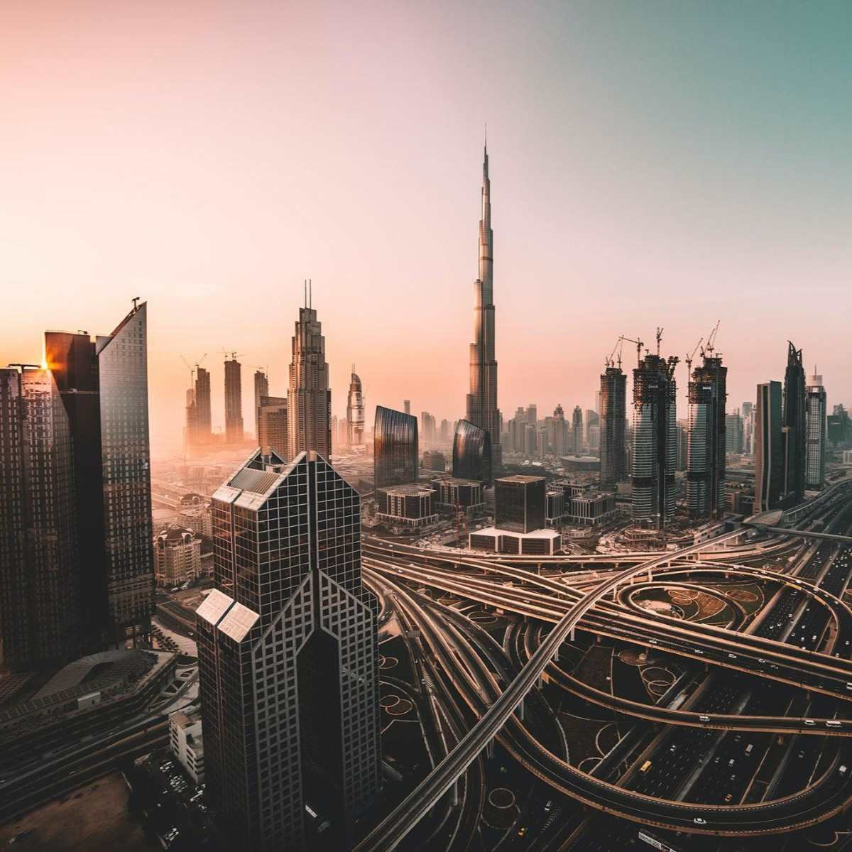 Dubai’s modern skyline and complex highway system illustrate its status as a leading economic hub.