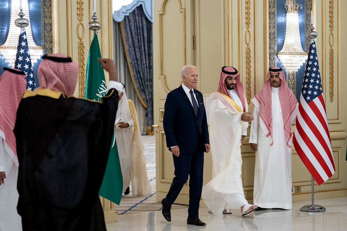 US President Joe Biden walks with Saudi Crown Prince Mohammed bin Salman during a diplomatic meeting.